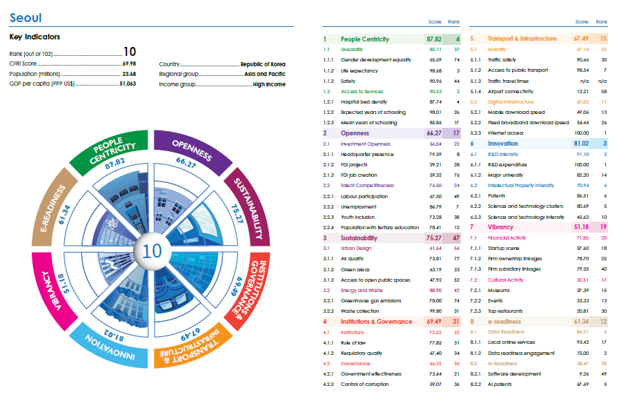 The 2025 CFRI reveals that cities pursue future readiness through distinct pathways. The top five cities, including London and San Francisco, excel in “Output” dimensions such as Innovation, Vibrancy, and E-Readiness, while the subsequent four leaders rely on strong “Input” fundamentals like People-Centricity and Sustainability. Seoul stands out as a unique hybrid, demonstrating high performance in both dimensions.