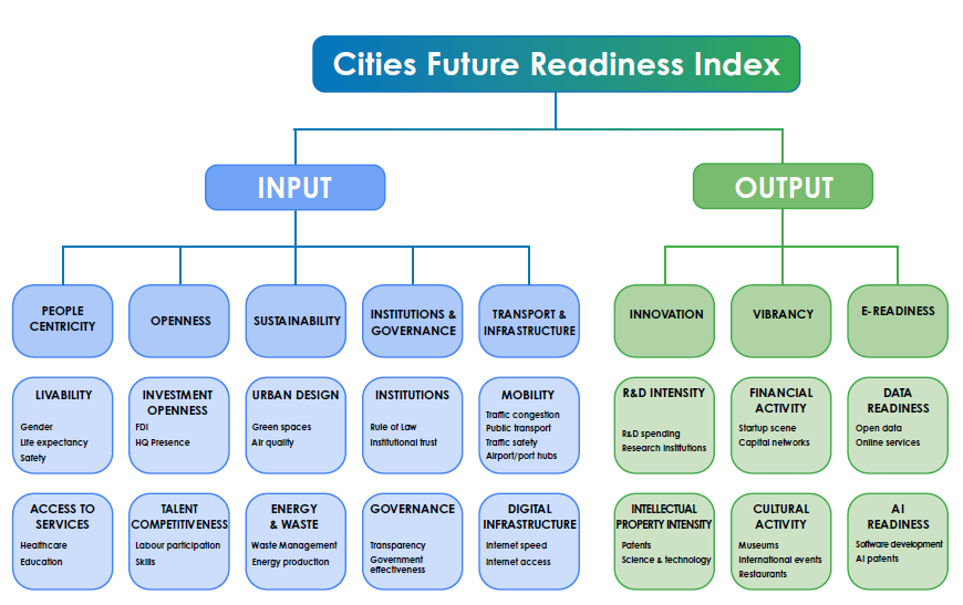 The Input Dimension consists of five pillars (People Centricity, Openness, Sustainability, Institutions and Governance, Transport and Infrastructure) that measure enabling environment and endowments. Meanwhile the Output Dimension includes three pillars (Innovation, Vibrancy, E-Readiness) that measure the tangible outcomes of those inputs. To ensure a holistic assessment, the POSITIVE model uses a precise, multi-layered framework built upon 44 distinct indicators, which are sourced from 32 quantitative data sets and 12 qualitative index data sets. The new index is the first ever to be entirely based on hard data.